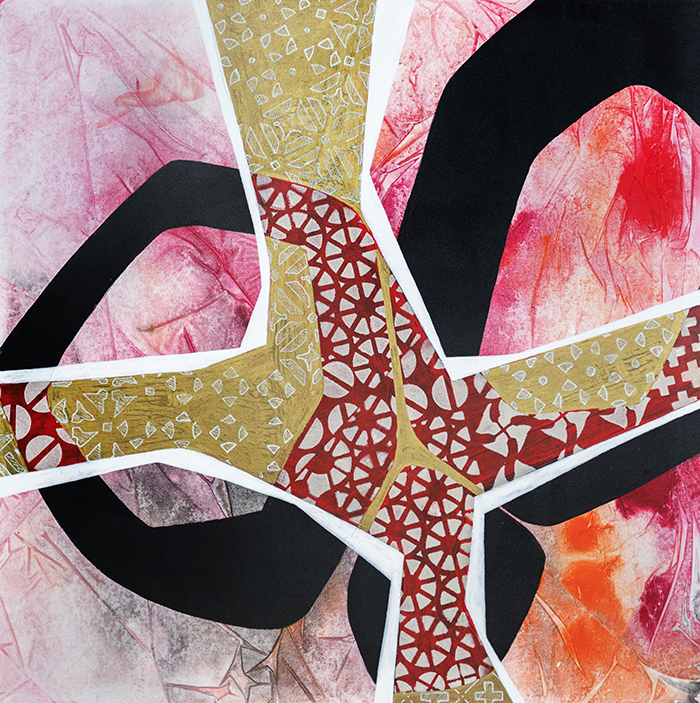 Toelichting: Abstract conceptual painting on wooden panel, the combination of painting and graphic elements. Used basic ( red, black, white ) colors and golden acrylic, covered by UV protection by Gloss Gel Acrylic Medium.