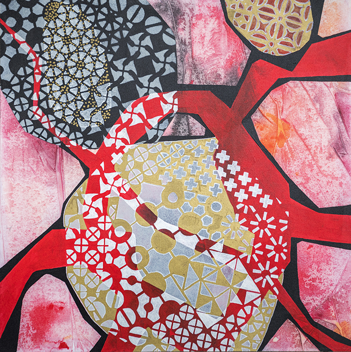 Toelichting: Abstract conceptual painting on wooden panel, the combination of painting and graphic elements. Used basic ( red, black, white ) colors and golden acrylic, covered by UV protection by Gloss Gel Acrylic Medium.